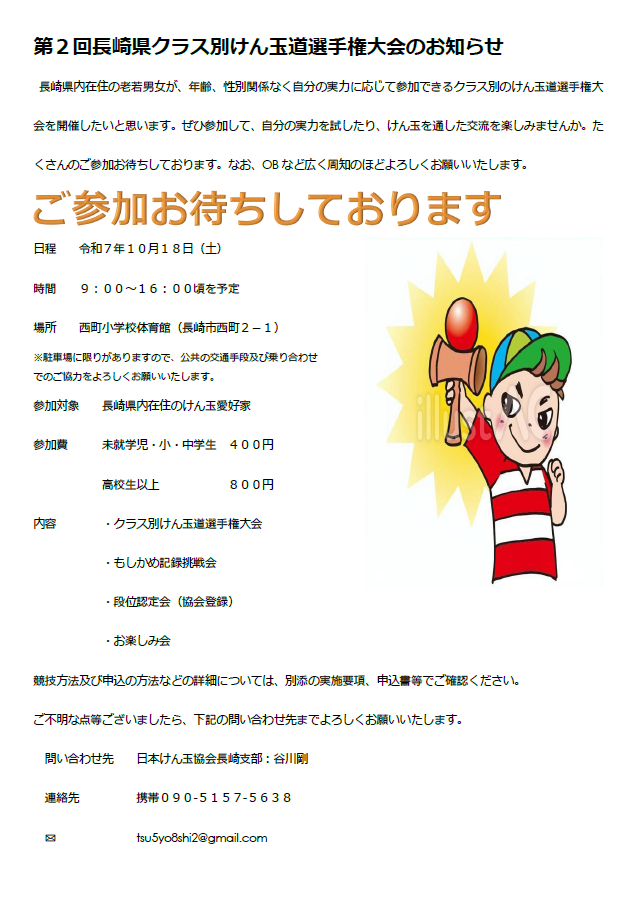 その他のイベント 各地のイベント情報 九州・第2回長崎県クラス別けん玉道選手権大会のお知らせ けん玉協会2025年9月24日2025年9月24日 Share Facebook Twitter Email 日時:2025年10月18日(土) 9:00~16:00(予定) 会場:西町小学校体育館(長崎市西町2-1) 参加対象:長崎県内在住のけん玉愛好家 参加費:未就学児・小・中学生 400円 高校生以上 800円 その他詳細はこちらをご確認ください。→ チラシ