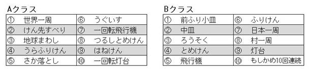 ②決勝トーナメントは定められた10種目をお互いに各1回ずつ行い(10点満点)得点の高い選手を勝ちとする。(同点の場合は年齢の上の者が上位となる。更に同年齢の場合、生年月日が先の者が上位となる。)合計ポイントに年齢ハンデと競技ハンデを加算する。