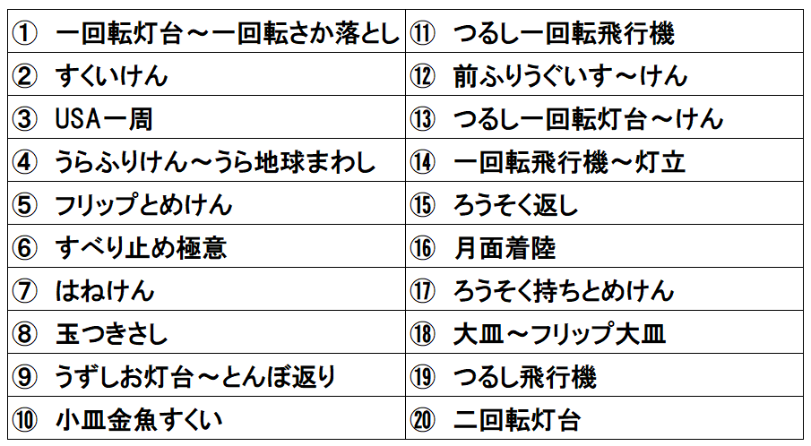 ③成功1回につき1得点とする。(決勝競技前半:30点満点、決勝競技後半:20点満点)